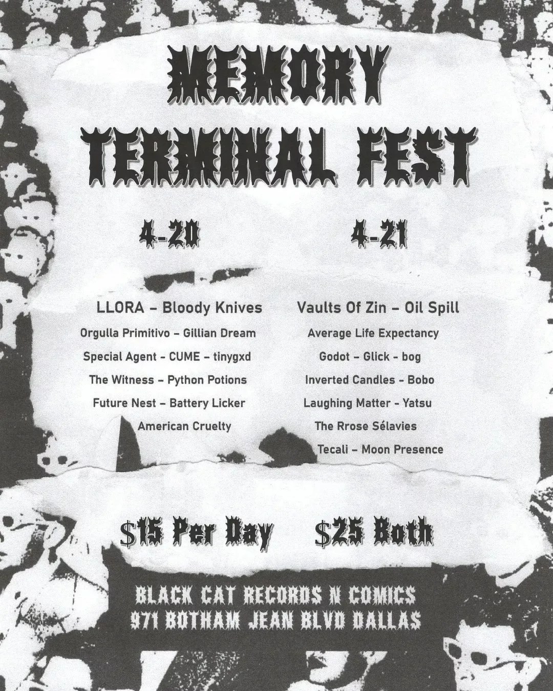 The first ever Memory Terminal Fest will be happening this April at Black Cat Records & Comics in Dallas, Texas on 4/20 and 4/21. They have assembled some of the sharpest acts their label has to offer, as well as some additional hometown heroes and a few out-of-towners. This lineup is epically stacked. More TBA such as vendors (food, drink, and art) and DJs, among other things. Keep your eyes peeled.